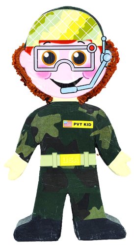 Our Soldier Pinata measures 235 tall by 13 wide Soldier wears camo army outfit belt tag helmet protective glasses and microphone Makes great decoration and fun party game at theme birthday parties Made of cardboard and tissue paper Pinata can be filled with up to 2lbs of toys and candy Incl Read More..