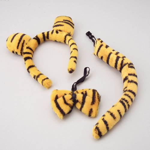 Let your wild side loose with these tiger costume accessories Tiger costume set includes plush ears plush tail and bowtie Headband size 6-12 W x 7-12 L Let your wild side loose with these tiger costume accessorie Includes plush headband tail and bowtie Ideal for a Halloween costume Also Read More..